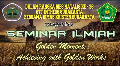 Dalam rangka Dies Natalis XXXVI STT Intheos Surakarta menyelenggarakan seminar ilmiah dengan tema "Golden Moment: Achieving with Golden Works". Seminar ini akan membahas mengenai tantangan zaman dan menjadikannya kesempatan emas bagi para pelaku Pendidikan Kristiani serta para Pelayan Tuhan, untuk membawa gereja memasuki masa keemasan.Seminar yang juga diselenggarakan bekerja sama dengan kantor Bimas Kristen Kemenag RI Surakarta ini menghadirkan beberapa pembicara, yaitu: Dwi Kuncoro, M.Pd.K. (Bimas Kristen Surakarta), Pdt. Yotam T. Kusnandar, M.Th. (STT Torsina), Pdt. Dr. Dolf Tiyono, M.Th. (STT El Shadday), dan Dr. Daniel Sutoyo, M.Th., Dr. Dra. Sarah Andrianti, M.Th., Dr. Sonny Zaluchu, M.Th. (STT Intheos Surakarta). Kontribusi peserta seminar sebesar Rp 50.000,- (lima puluh ribu rupiah), dan sudah termasuk makan siang dan sertifikat yang juga ditandatangi oleh Bimas Kristen Surakarta. Untuk pendaftaran dan info lebih lanjut dapat menghubungi : Elis (087836737714), Evan (085799784606), Vanes (081327288711). Brosur seminar dapat diunduh di Download Area . | ||