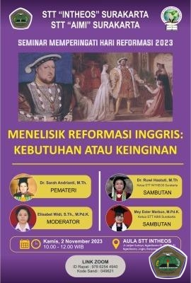 Kamis, 2 November 2023, STT Intheos Surakarta bersama dengan STT AIMI Surakarta mengadakan Seminar/Webinar memperingati Hari Reformasi dengan tema "MENELISIK REFORMASI INGGRIS: KEBUTUHAN ATAU KEINGINAN."